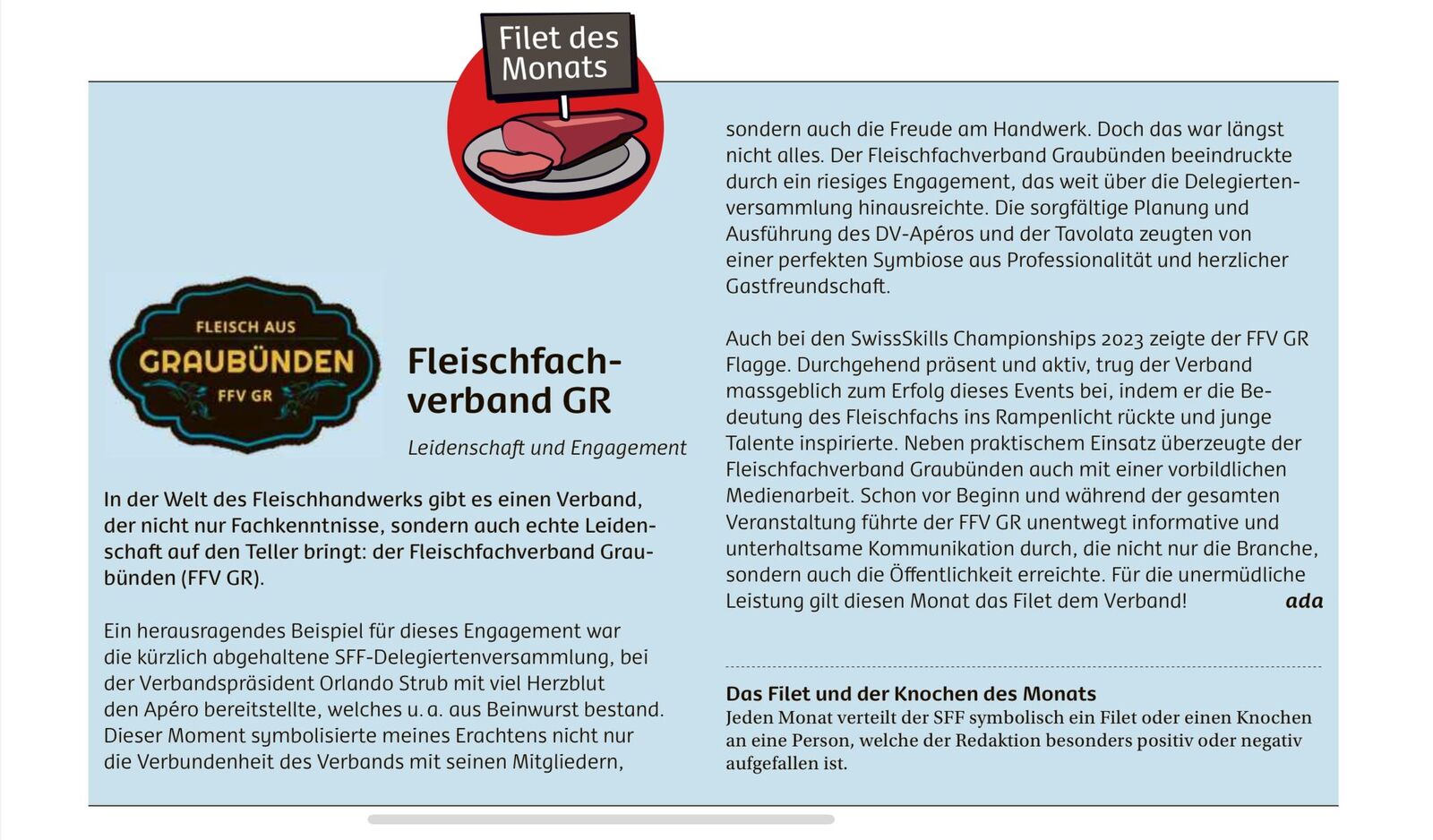 Wir haben vom Schweizer Fleischfachverband die Auszeichnung "Filet des Monats" erhalten.